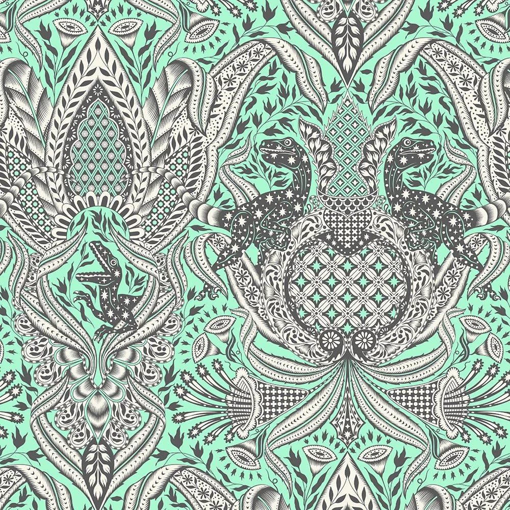 Everything that I do as a fabric designer is about indulging my childhood fantasies. I try to hold on to all of the things that we so easily let go of as we grow up like wonder, amazement, creative logic and delight. Typically, dinosaur fabrics are for children and I don't know who made that decision but I wildly disagree. Roar! is whimsical take on fancy dinosaurs for those of us who keep one foot firmly planted in fantasy. My prehistoric landscape is drenched in details and color. Here you will find a sophisticated T-Rex in a topiary, A Triceratops out for a stroll on a windy parkway path, Happy little hidden Raptors in a dainty damask and Pterodactyls taking time to smell the flowers. It's just your average lazy afternoon in the garden with the giants of Earth's history.
