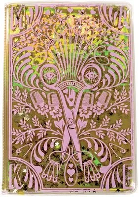 This Maker's Journal features a cover with floating glitter and Tula Pink's Getting Snippy image from her Homemade collection. The journal features 192 gridded pages and measures 9" x 13"